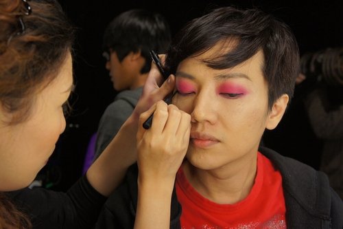 在化妝室裡,為對方繫上妖媚馬甲、描畫艷麗妝容
