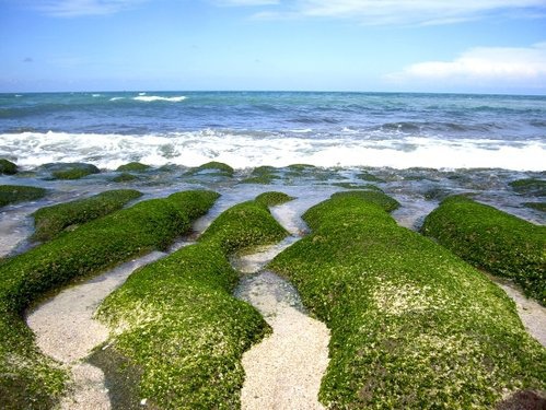 等到四月份東北季風漸歇,石槽就長滿了一大片綠色的海藻,