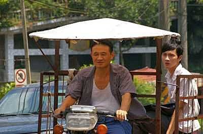 急忙地騎著三輪車載兒子去火車站,竟然將褲子給穿反了,