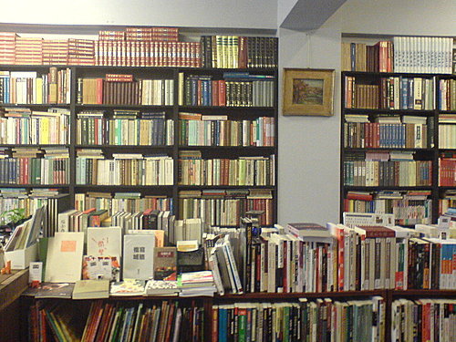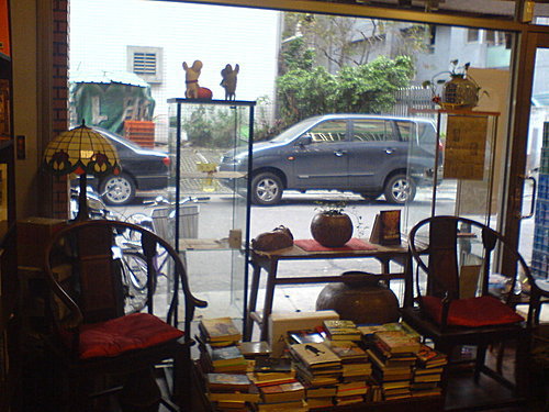 「舊香居」顯得寬敞,原因除了四壁皆書,無論繁簡;牆上有畫,囊括中西,屋裡僅散置了幾架置物木几,跟提供客人休憩的兩張座椅。這樣的空間規劃,似已擺明跟插架疊落無所不用其極的傳統舊書店,或近日甚囂塵上兼營咖啡座生意的二手書店有所區隔,但也因此有著中外古玩店特有的雅緻古意,此或所以被媒體硬生生加上「古董舊書店」封號的由來吧!?