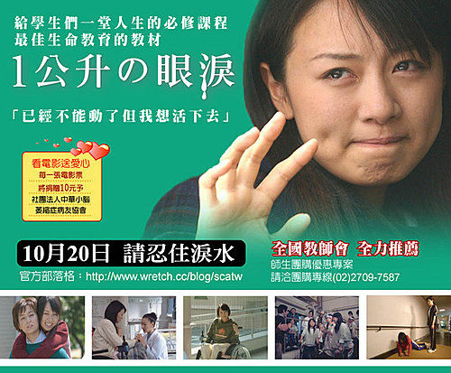 這是一個感人的真實故事, 是在敘述一個罹換脊髓小腦萎縮症的女孩木藤亞也的故事, 一個堅強忍受著疾病痛苦也要活下去的故事, 我沒來得及閱讀這個故事主角木藤亞也的原著, 也沒有看過改編成的日劇「一公升的眼淚」, 我是直接看電影版的「一公升的眼淚」, 我只能說看到後半段我也陪著留了許多眼淚, 我想套句日本東京都知事石原慎太郎說的話: 「因爲生命而倍感苦惱的人們,推薦你們看這部電影」。 那麼你會發現,比起木藤亞也, 我們能夠健全的活下去, 是一件很奢侈的幸福,我們還在怨甚麼!