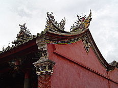 燕尾舒暢,牆身斑駁,內以紅磚為材料,外飾白灰,古樸典雅。廟